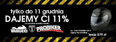 Tylko do 11 grudnia w moto-akcesoria.pl rabat 11% na wszystkie produkty marek: Vanucci, Highway1, Probiker. Zapraszamy